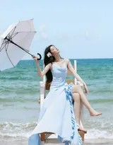 浅蓝色,是天空倒映在海面的颜色,也是这组写真的主旋律。那条轻盈的吊带长裙,采用垂感极佳的面料,随着海风的节奏自由舞动。两根纤细的肩带勾勒出优美的肩颈线条,简约的设计反而突显了穿着者本身的气质。裙摆处时而随风扬起,如海浪般起伏;时而轻抚沙滩,留下温柔的褶皱。这种介于精致与随性之间的着装,与海边的氛围完美契合——既不失仪式感,又拥有与自然对话的松弛。